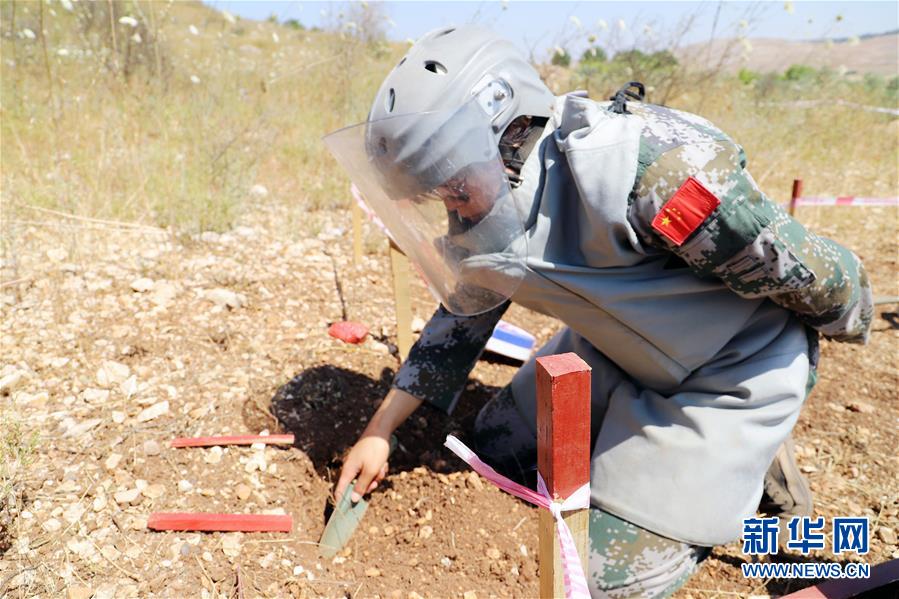 6月28日,在黎巴嫩南部与以色列临时边界“蓝线”附近一处雷场,女扫雷手鲁艳红进行扫雷作业。新华社发(孙帅摄)