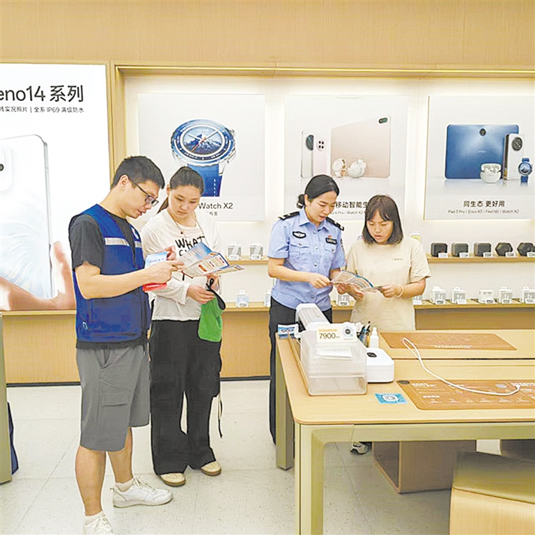 近日,浒山司法所联合浒山派出所及新悦社区走进吾悦广场商业区,开展“禁毒+反诈”主题宣传教育活动,为商户送去实用的法律知识及安全防范技能。 摄影全媒体记者 戚一翔 通讯员 王诗蓓
