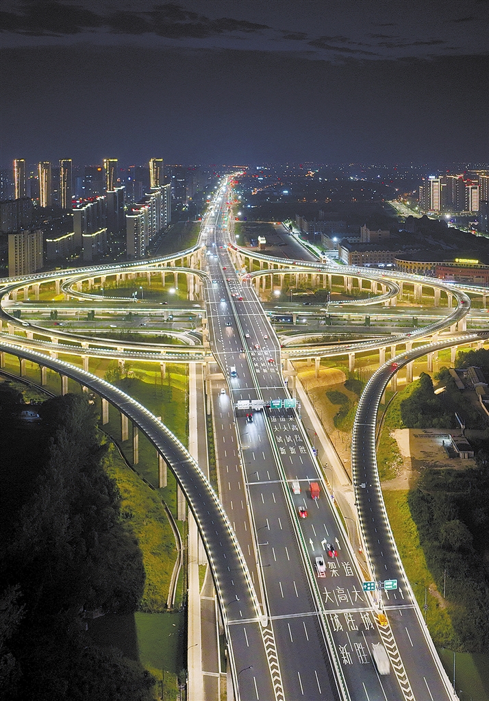 近日,从空中俯瞰中横线快速路(一期),来往车流的灯光在夜幕下绘就一幅流动的璀璨长卷。