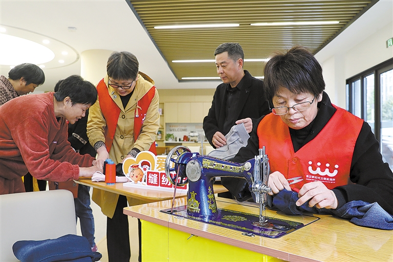 日前,宗汉街道锦漾社区党群服务中心内,志愿者们正在为老年人提供衣物修补服务。此举看似微小,却有效提升了社区生活的便利度,让居民切实感受到社区的关怀与温度。摄影全媒体记者 王烨江 通讯员 王梦青
