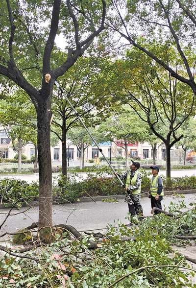 近日,市城市管理服务中心组织养护工人对开发大道上过于茂密的行道树进行修剪,为市民营造更安全、更阳光的出行环境。