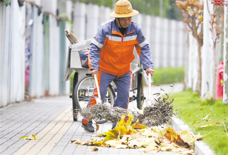 受此次强冷空气影响,白沙路街道白河路行道树落叶骤增。为保障环境整洁,环卫工人高频次清扫应对落叶潮,用朴实的劳动守护城市的清爽。 摄影 全媒体记者 王烨江