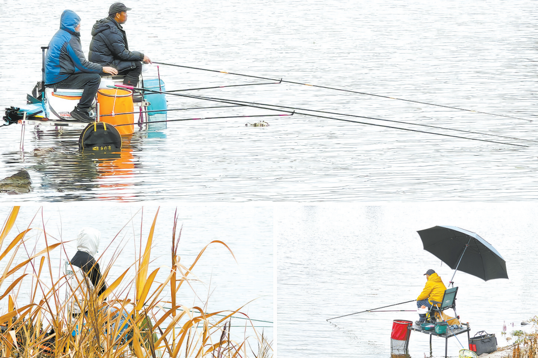 近日,尽管潮塘江畔凉风瑟瑟,钓友们仍享受着垂钓的乐趣,他们或坐在钓鱼平台上,或隐于芦苇丛中,全神贯注地盯着水面,等待着鱼儿上钩。