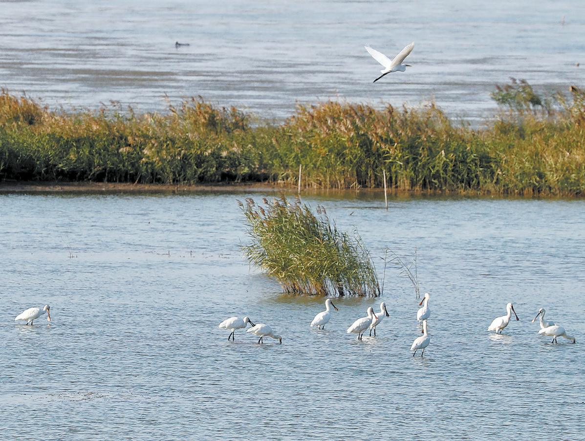 近日,杭州湾湿地迎来候鸟栖息旺季,浅滩水域上,各种野生鸟类或低头觅食、或展翅盘旋,构成灵动的生态画卷。