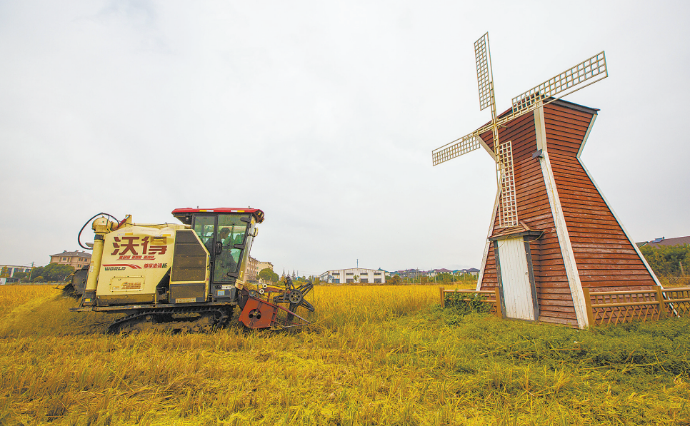 近日,周巷镇农田治理核心区,金黄的稻田里,收割机机声隆隆穿梭于此,农户们抢抓农时全力抢收,确保颗粒归仓。 摄影 通讯员 成文波