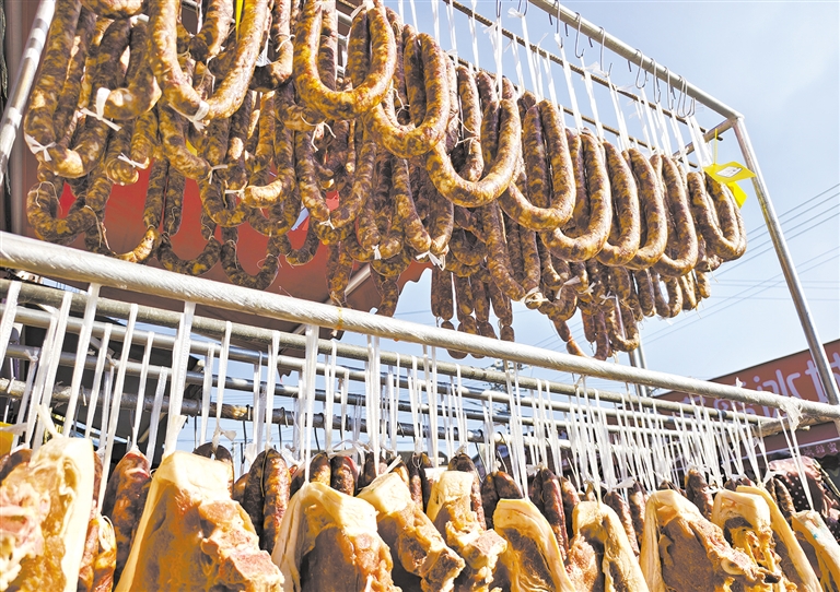 冬日时节,横河镇宜青桥肉铺摊前的腊味成了一道独特风景。一串串腊肠、一块块腊肉整齐悬挂,在阳光下散发着浓郁的香气,为寒冷的冬日增添了烟火气息。 摄影 全媒体记者 王烨江