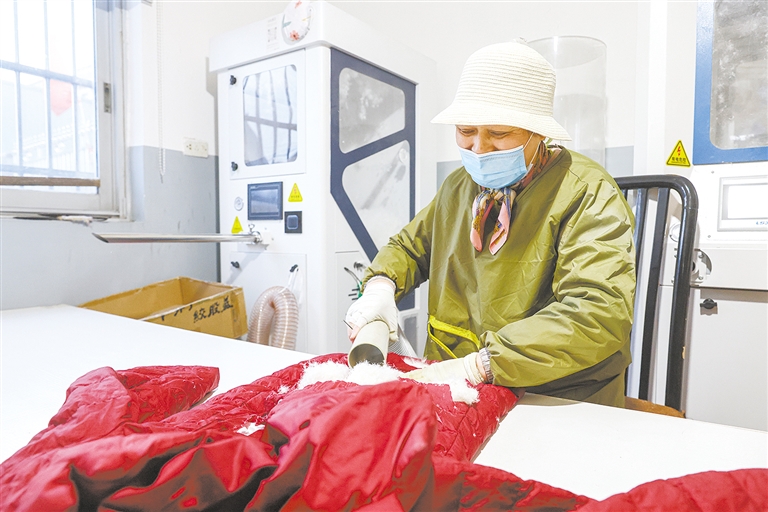 近日,在周巷镇三江口村一羽绒被定制工坊,村民徐莉正忙着把旧羽绒服拆衣、取绒、消毒、称重,把几件旧衣“化零为整”,变成一床床蓬松温暖的新被子。这一改造既避免了旧衣浪费,又为冬日增添了一份温暖,成为市民环保生活的新风尚。摄影 全媒体记者 蒋亚军 通讯员 马文杰