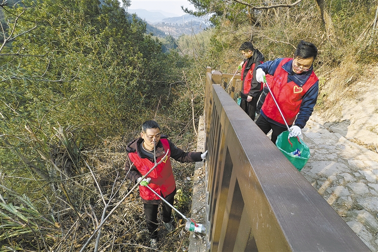 近日,一群志愿者自发组织开展环保行动,他们拎着垃圾袋、拿着钳子,在栲栳山健身步道沿途清理各类垃圾,同时呼吁市民和游客不要随手丢弃垃圾,做到文明出游。摄影 全媒体记者 王烨江