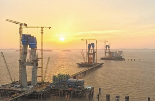 全桥设北、中、南三座航道桥共7座主塔,均设有通航孔。其中北航道桥8号主塔已于今年1月封顶,剩余6座主塔将在今年陆续封顶。